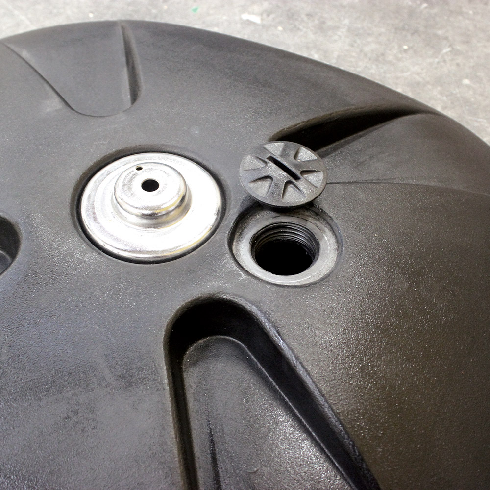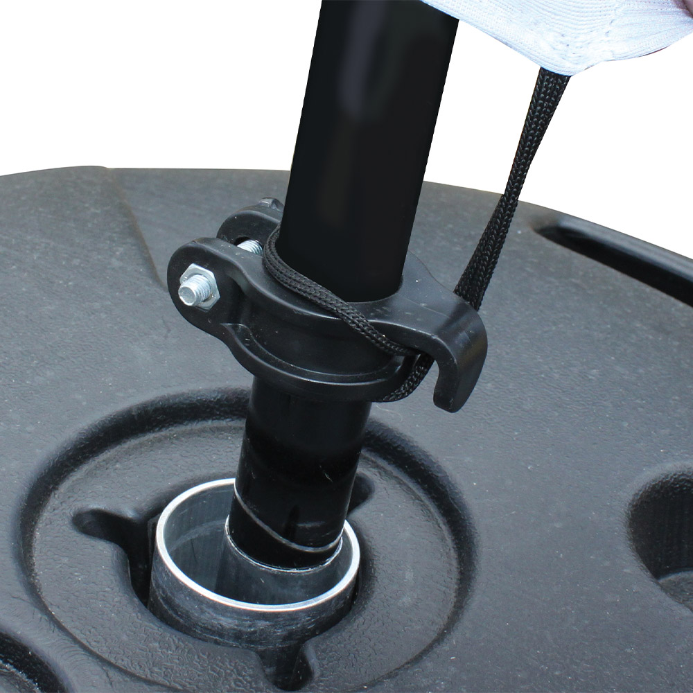 • Bases versáteis: Base moldada em polietileno preto de alta densidade, empilhável (até três bases). Peso da base quando cheio de água é de 30,4kg.