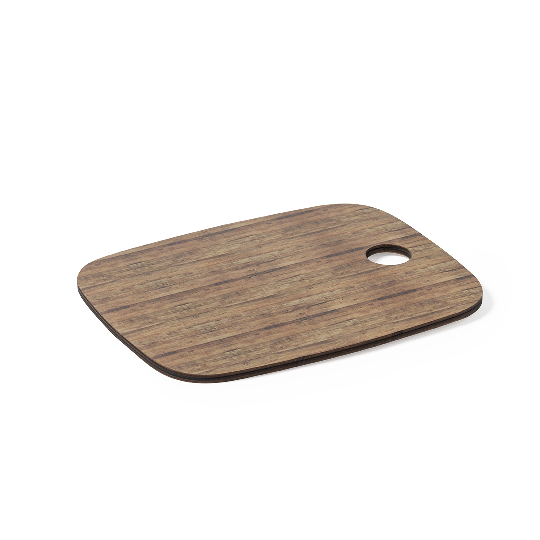Tábua de corte e apresentação fabricada em madeira natural, com buraco para pendurar