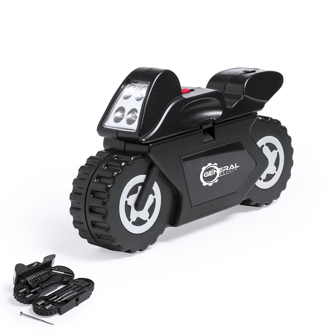 Conjunto de ferramentas de 14 acessórios em uma caixa resistente com um design de motocicleta, com lanterna 4-LED integrada