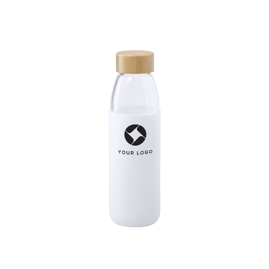 Fabricada com corpo em vidro e tampa de rosca de bambu