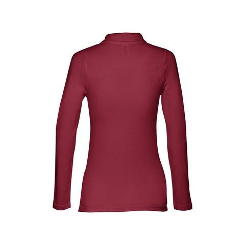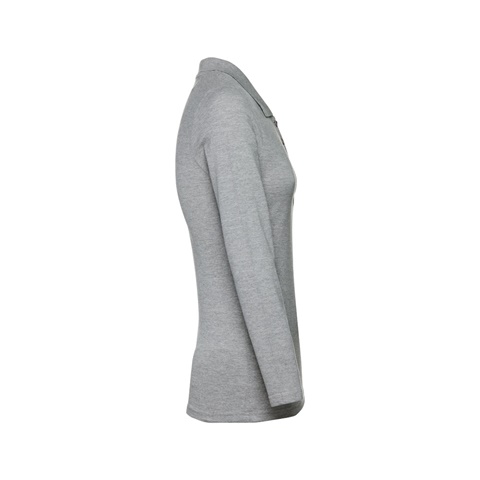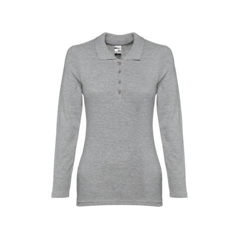 Polo de manga comprida para senhora em malha piqué 100% algodão cardado (210 g/m²) (cor 183: 85% algodão/15% viscose). Gola em Rib reforçada com fita em malha piqué. Contém carcela reforçada com 4 botões à cor (botão suplente inserido na costura interior). Peça cortada e cosida com mangas com costura dupla. Etiqueta visível removível. Tamanhos: S, M, L, XL, XXL