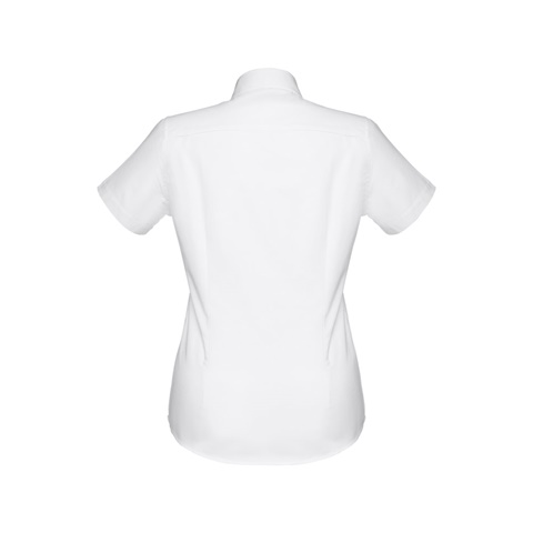 Camisa oxford de manga curta para senhora em 70% algodão e 30% poliéster (130 g/m²). Camisa cintada com 2 pinças nas costas e frente e costura dupla na bainha das mangas. Contém carcela com 7 botões de cor pérola. Tamanhos: S, M, L, XL, XXL
