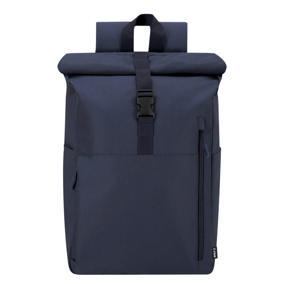 Mochila confeccionada em resistente RPET 300D, com sistema de fecho enrolável e fivela.