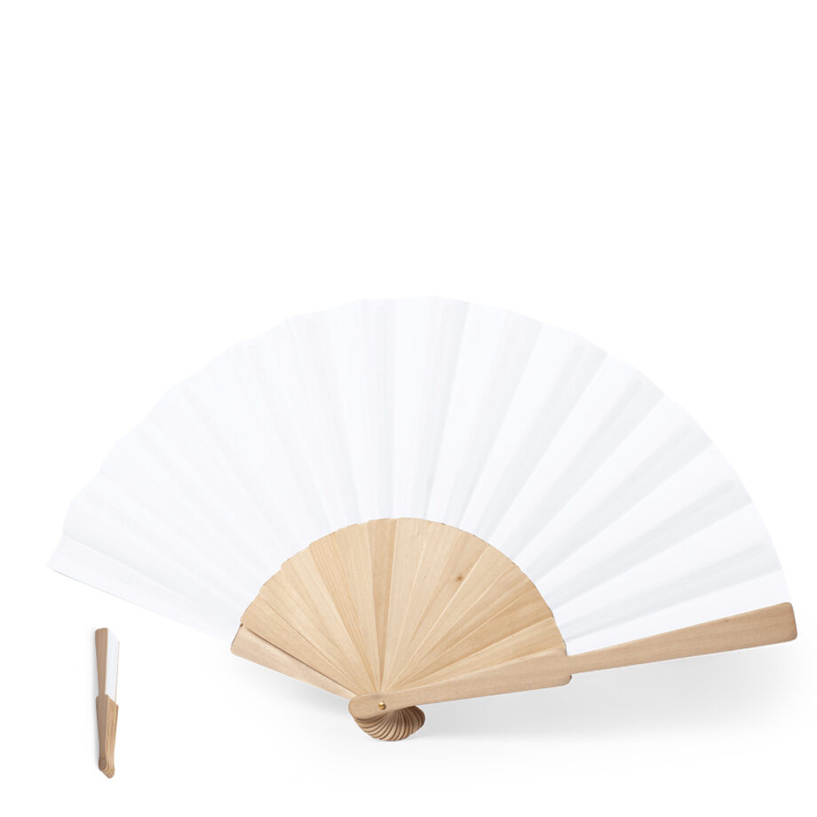 Fan da linha da natureza com costelas de madeira e tecido em material RPET, obtido de materiais plásticos reciclados, para incentivar a reutilização de resíduos plásticos e contribuir para a sustentabilidade da Terra